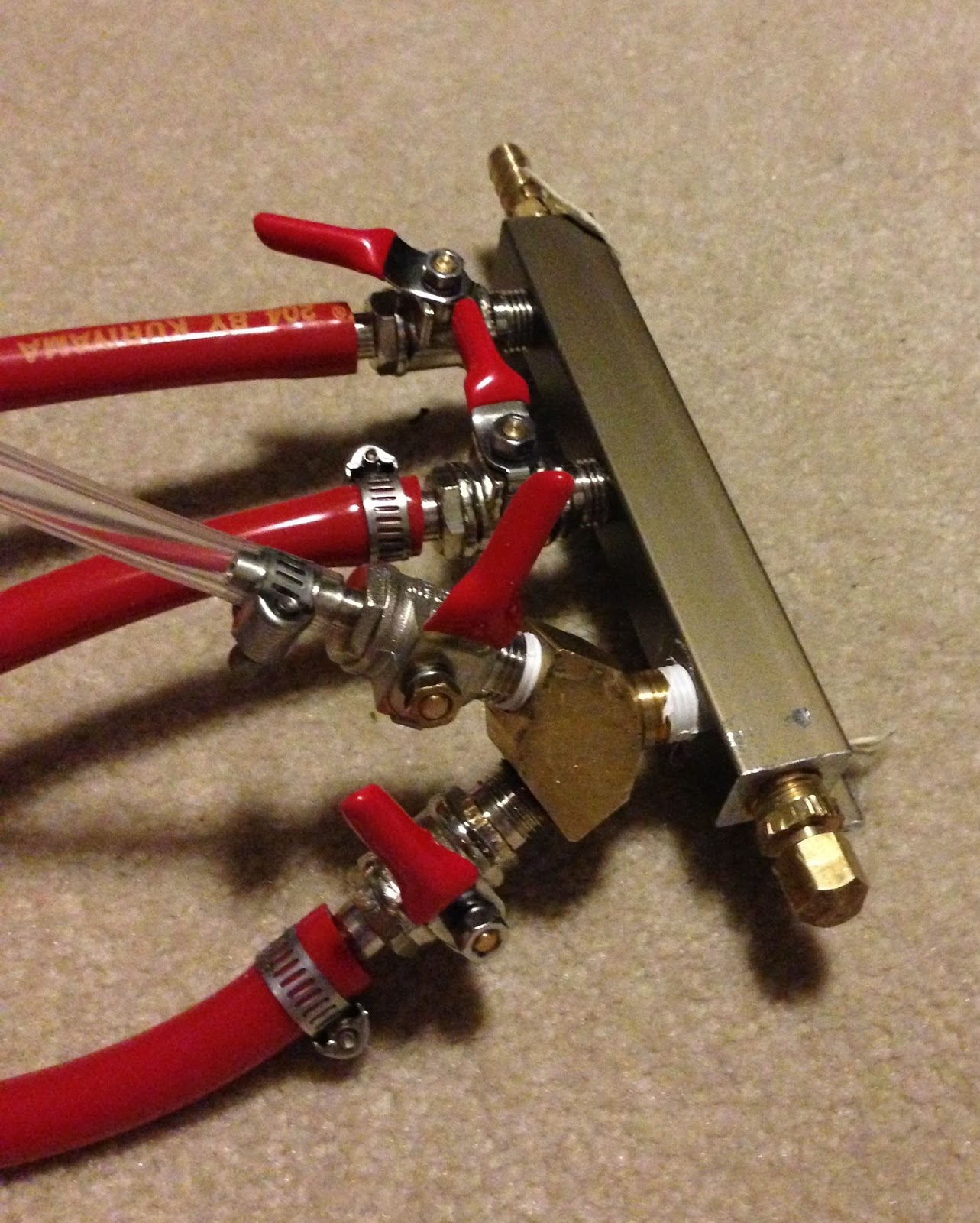 Now that we have a pipeline going with enough beer and kegs, it was time to upgrade our manifold a bit. When we got the kegerator, we planned on 3 taps, so we bought a manifold with 3 valves to carbonate/dispense each tap (the 3 red gas lines in the picture above). Now that we want to have beer “on deck” and carbonating while not on tap, we need to expand our gas line options.